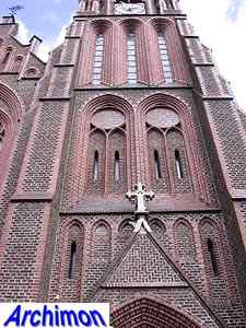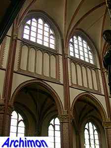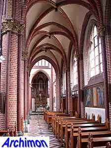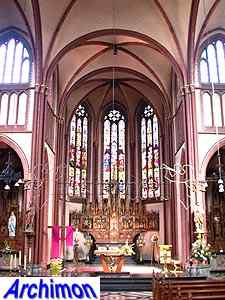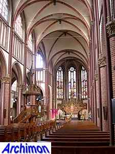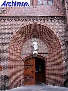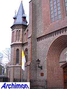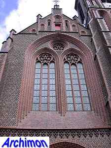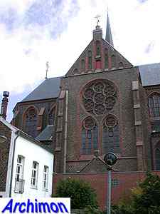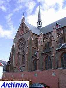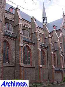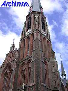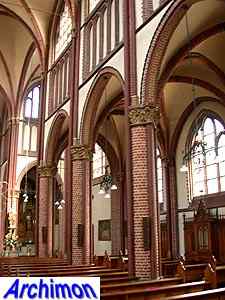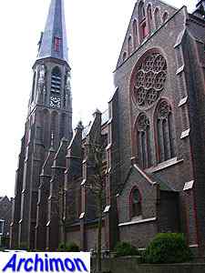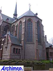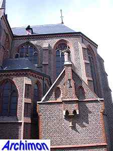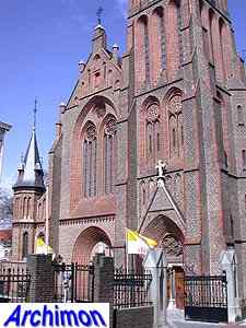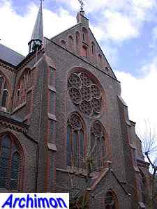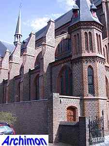For more than a century the catholics of Vaals had used a church that shared a tower with the protestant church. It obviously had become too small by 1890. In that year Johannes Kayser is asked to design a new church that is to be built on a different location in the town. In 1891 the bricks are made, the actual construction starts in May 1892. In October 1893 the church is consecrated. The finished church is one of Kayser's best works. It's a three-aisled cruciform basilica in neo-Gothic style. Like in many of Kayser's other churches this style was inspired by North-German brick Gothic architecture, resulting in an exterior with many details. Typical features are the deep niches in which are the windows and doors, and the use of glazed bricks. Unlike some of his previous churches Kayser does not add stepped gables this time. In front of the southern side-aisle is a 60 metres tall tower. The upper segment of this tower is octagonal and is surrounded by pinacles on the square segment under it, like in many of P.J.H. Cuypers' churches, Kayser's former tutor. At the north-western corner of the church is a baptistry with a small tower. |