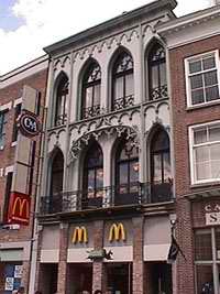 A shop in 's-Hertogenbosch, the facade of which unfortunately has been mutilated. Unlike the example above, where some constructional Gothic features were used, here the decorative aspects of Gothicism have been copied for something new.